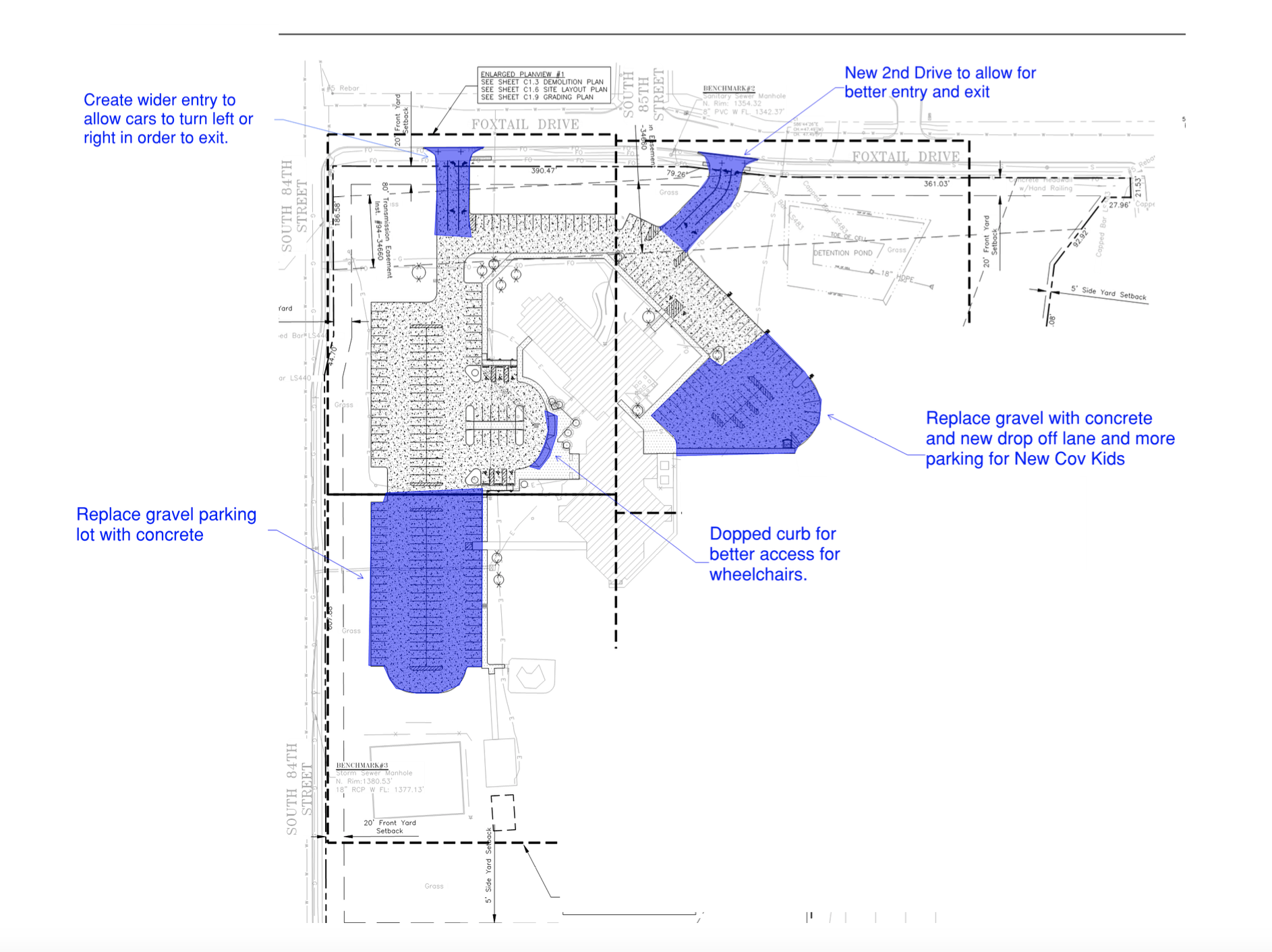 In 2023, New Covenant Leadership appointed a team to begin assessing costs and scope of work for needed improvements to sidewalks, entrances, parking, and traffic flow, along with some aesthetic improvements. Work started on the project in Summer 2024.